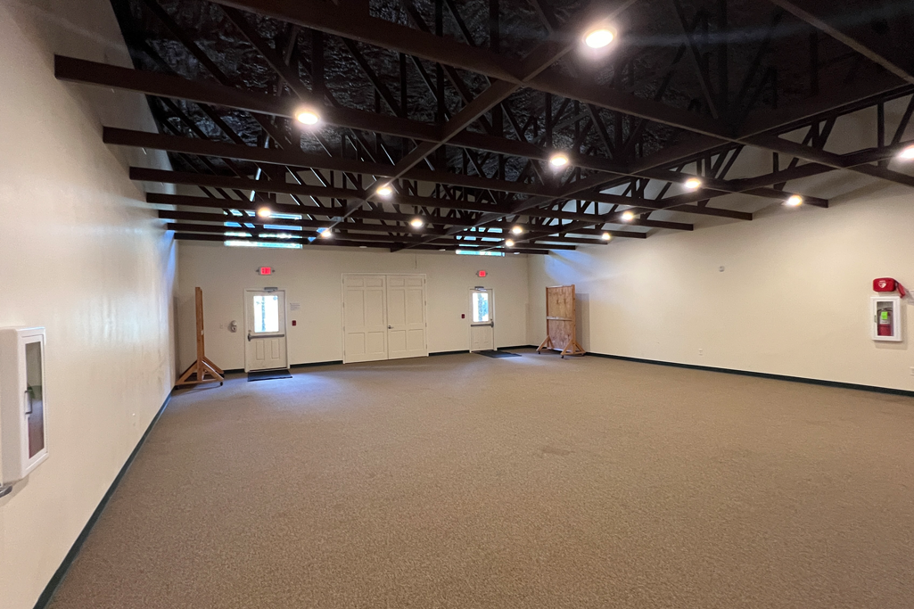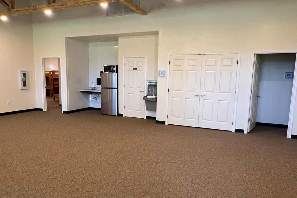 The meeting room is automatically included for groups lodging in the dorm. The room is roughly 33’ x 42’. The two storage closets contain cushioned seats for 100, eight 6ft round tables, and three smaller 3’x5’ tables. Guest groups can elect to rent a screen, projector, and basic sound system.