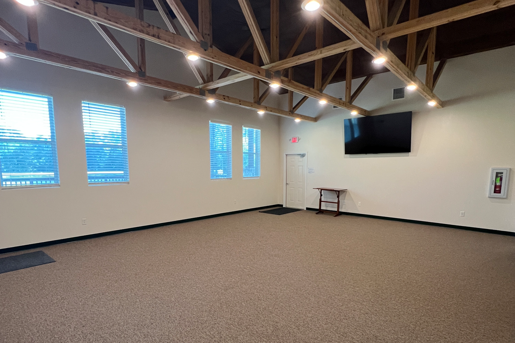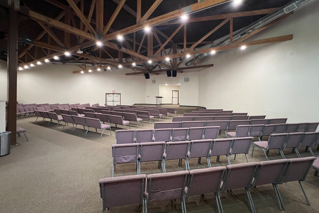 This 40’ x 45’ dedicated meeting space offers versatility. It has been used as a primary meeting/worship space, craft room, bible classroom, and an adult breakroom. Depending on the arrangements needed and purpose for the event, it can accommodate groups ranging 110-170. The storage closet contains cushioned chairs for 130 along with 29 tables (mixture of 6’ & 8’). The kitchenette contains a large commercial two door refrigerator to hold a stockpile of drinks, in addition to an ice machine, microwave, and range for holding warm items.
