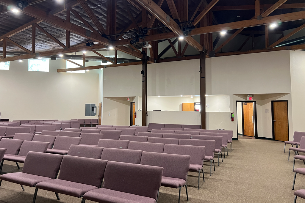 This 60’ x 60’ dedicated meeting space has high ceilings and full AV for your worship service. Seating capacity is 340. The projectors utilized by the audience are directed at both walls on either side of the stage. Those on stage have a confidence monitor projected on the back wall above the sound booth. The sound booth has: